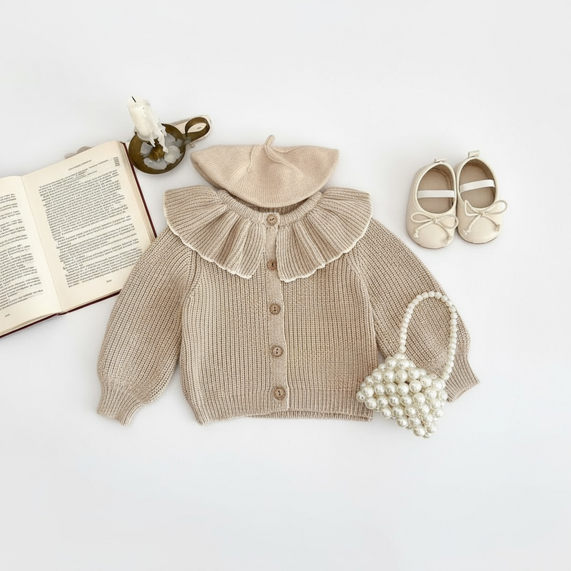 Keep your little one cozy and stylish with this soft knit cardigan. Featuring a cute ruffle collar and wooden buttons, it’s perfect for autumn and winter days. Gentle on baby’s skin and easy to layer.